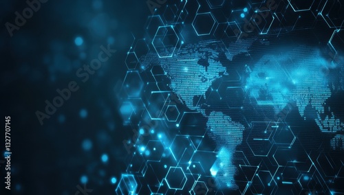 Wall mural digital technology background with a blue digital world map and hexagon pattern for global business,