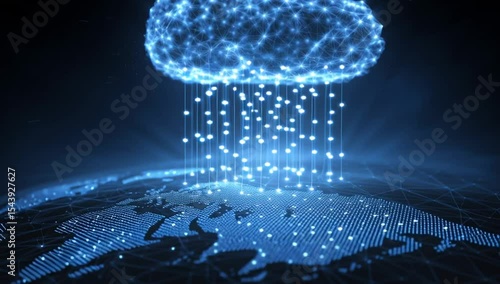 Wall mural digital technology concept, a blue glowing cloud icon with a network connection on an earth map back - Wall murals Wall mural digital technology concept, a blue glowing cloud icon with a network connection on an earth map back - Wall murals
