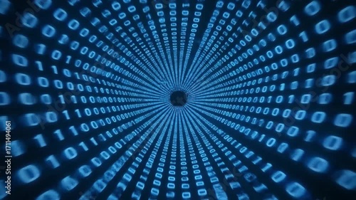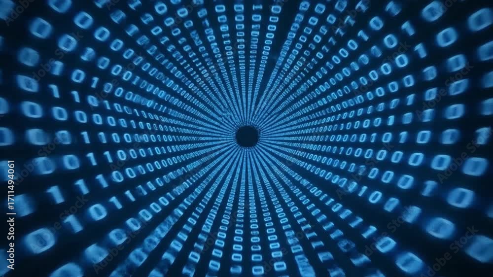 The watermark will not be included on Wall mural.: Digital tunnel of glowing blue binary code receding into darkness, representing data flow and techno