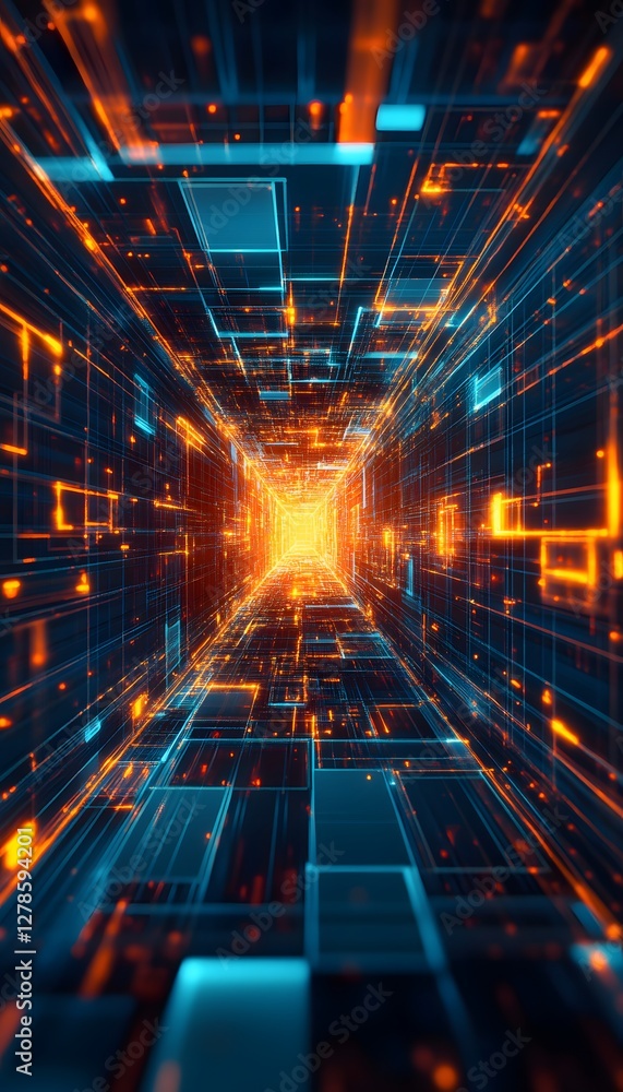 The watermark will not be included on Wall mural.: Digital tunnel with glowing lines and geometric shapes