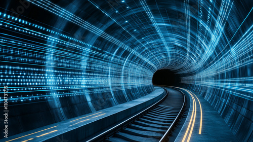 The watermark will not be included on Wall mural.: Digital tunnel: a futuristic tunnel filled with glowing blue code and railway tracks leading to a di
