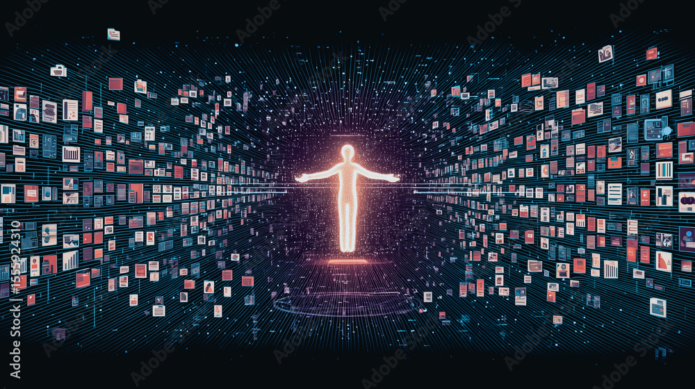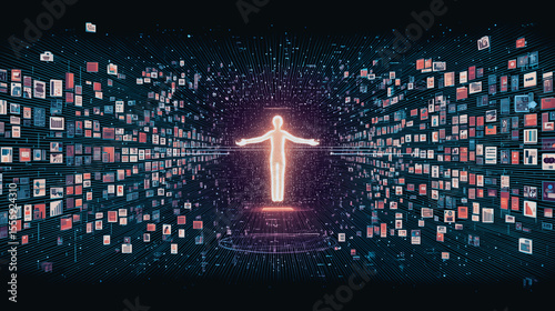Wall mural digital universe: a luminous figure extends arms within a dynamic digital space, surrounded by count - Wall murals Wall mural digital universe: a luminous figure extends arms within a dynamic digital space, surrounded by count - Wall murals