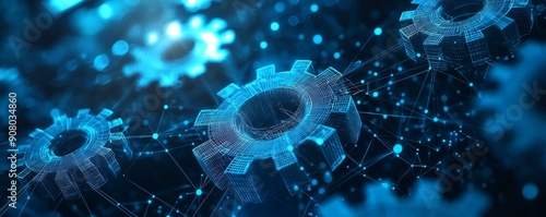 Wall mural digital wireframe gears interconnected with a network in a futuristic blue background