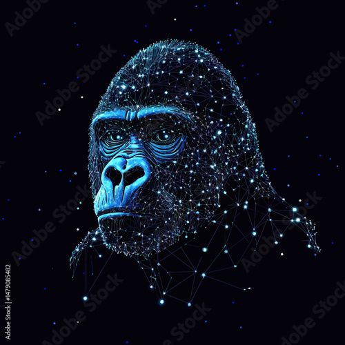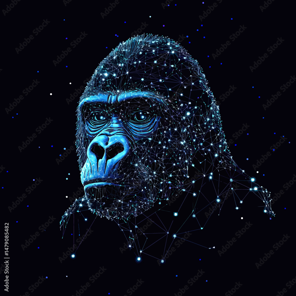 Wall mural digital wireframe gorilla head composed of glowing blue network nodes and lines on dark background w