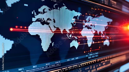 Digital world map with data points and glowing lines, representing global communication, technology,Wall mural
