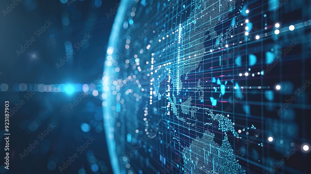 Wall mural : Digital world map with glowing lines and dots representing data flow -
