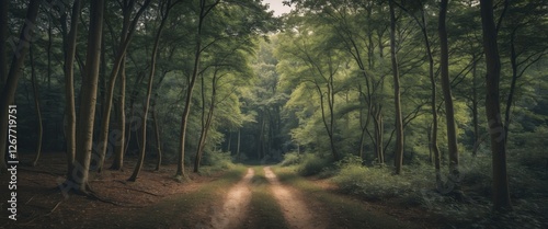 Wall mural dirt path through a dense green forest with tall trees and soft sunlight filtering through the leave - Wall murals Wall mural dirt path through a dense green forest with tall trees and soft sunlight filtering through the leave - Wall murals