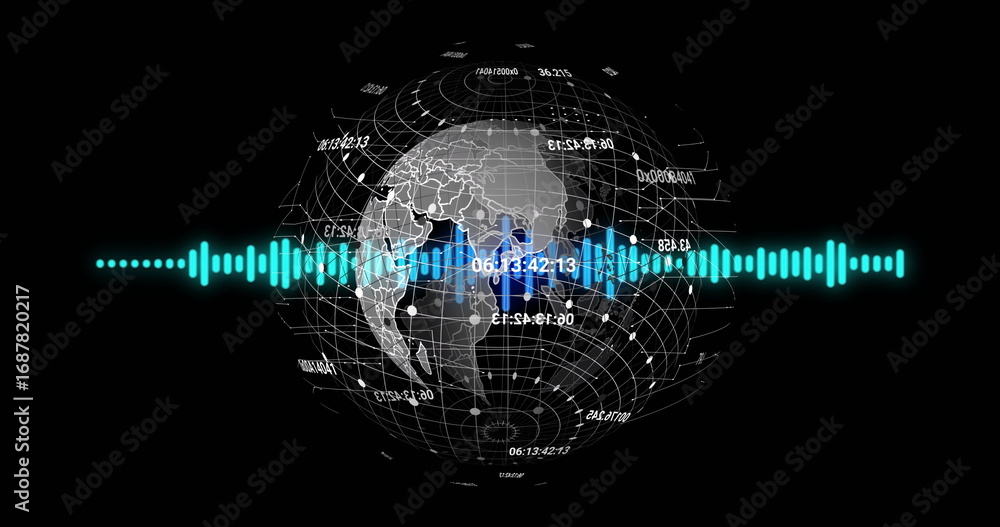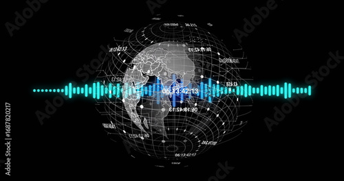 Wall mural : Displaying 3d wireframe globe with grid lines and numeric labels on dashboard, with audio waveform