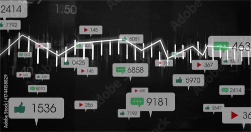 Wall mural : Displaying abstract visualization in dark dashboard, with white line graph and social metrics icons