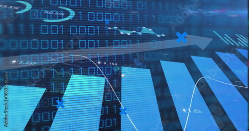 The watermark will not be included on Wall mural.: Displaying blue bars rising at center on digital dashboard, with binary code and white line graph