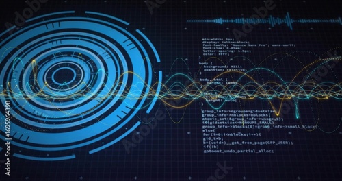 Displaying blue scanning graphic with multicolored waveforms and code text on interface, copy spaceWall mural