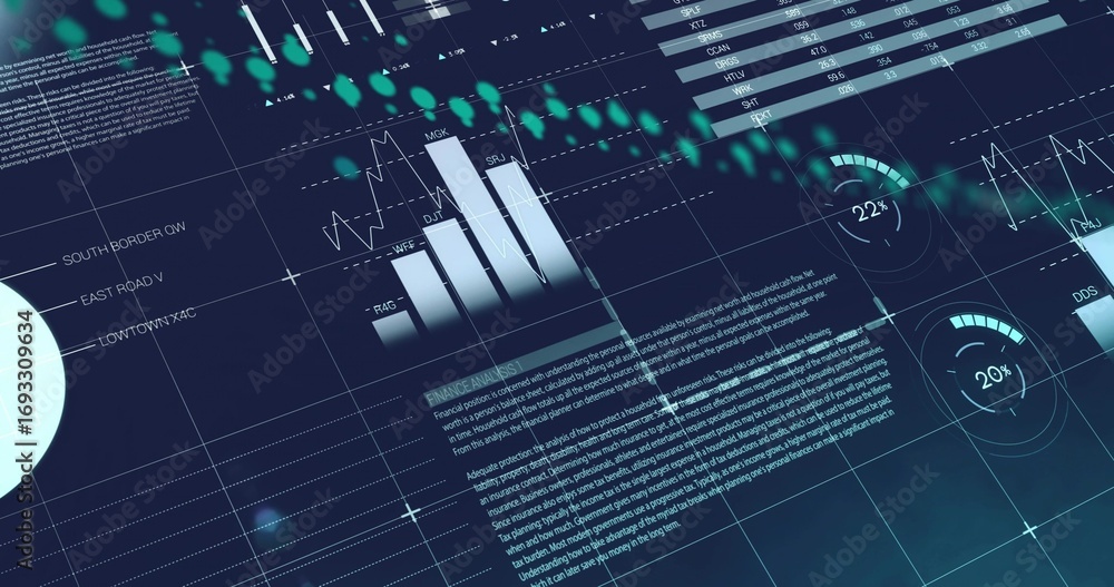 Wall mural displaying data dashboard on grid plane with bar charts line graph gauges data table annotations - Wall murals Wall mural displaying data dashboard on grid plane with bar charts line graph gauges data table annotations - Wall murals