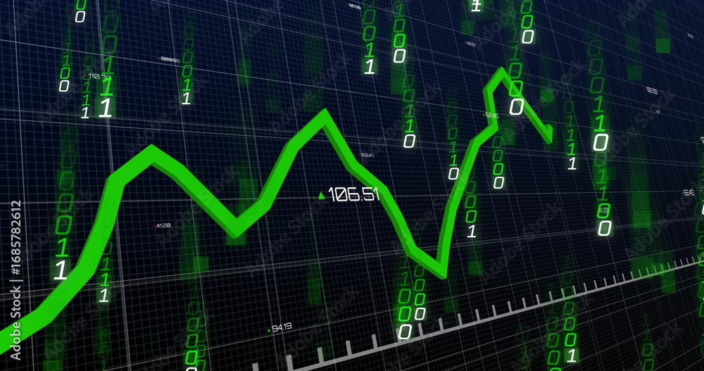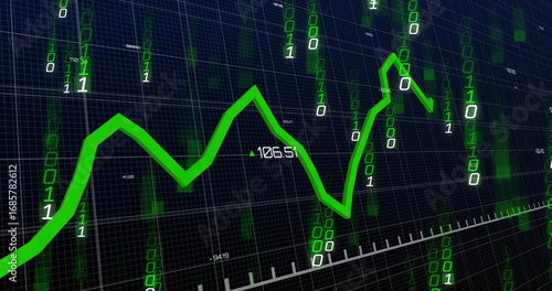 Wall mural : Displaying green line graph zigzagging in trading interface with binary digits and numeric labels