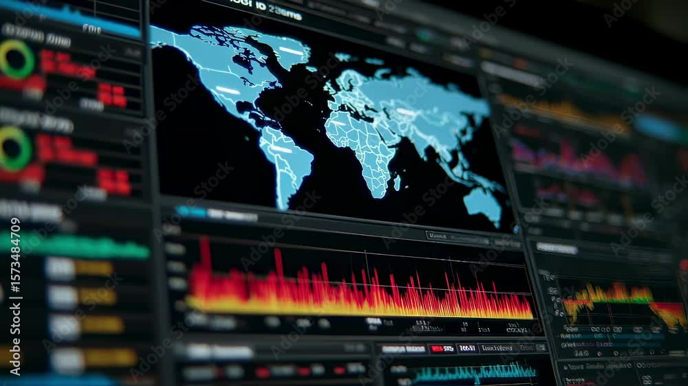 The watermark will not be included on Wall mural.: Displaying multiple colorful data charts and diagrams alongside a world map, illustrating global act