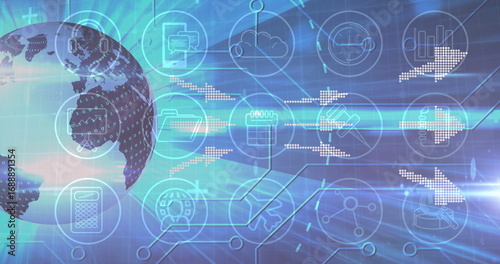 The watermark will not be included on Wall mural.: Displaying pixelated globe with binary overlay on left at data network with tech icons, copy space