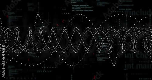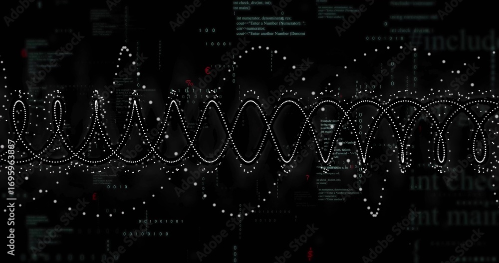 The watermark will not be included on Wall mural.: Displaying white dotted waveform oscillating across console with binary bits and code fragments