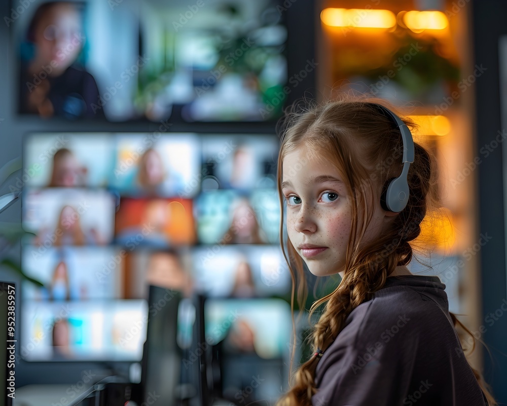 Wall mural : Distance learning science fair with students presenting projects via video calls and digital display