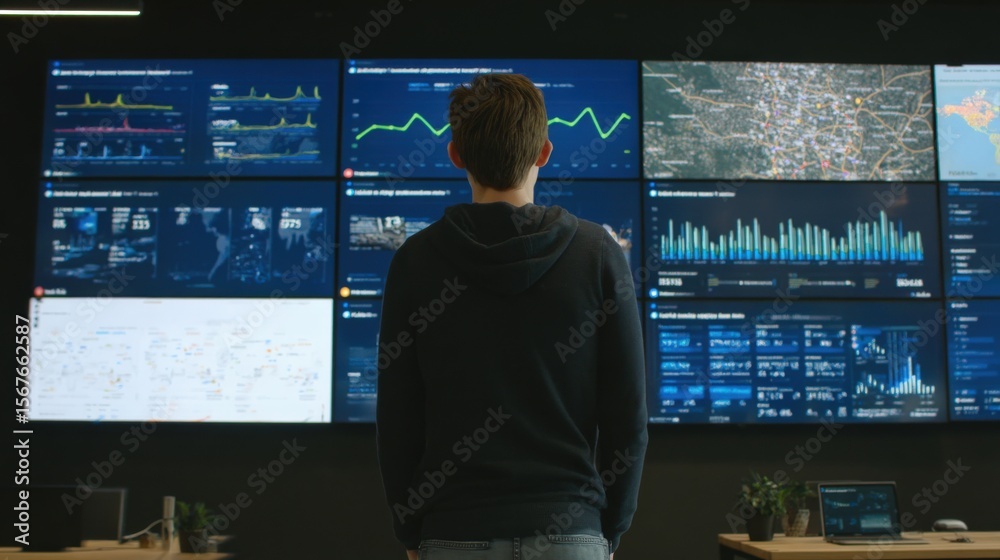 Diverse operations team member analyzing data visualization tools and metrics on digital dashboard, Wall mural