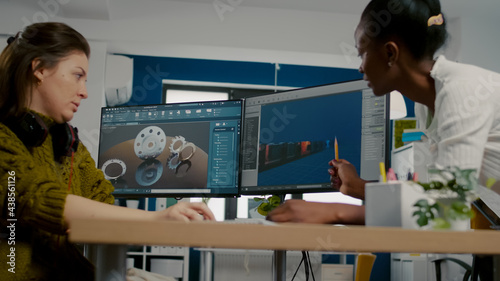 Wall mural : Diverse women game software developers creating game interface sitting in startup creative agency co