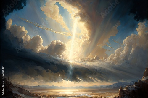 The watermark will not be included on Wall mural.: Divine light shining from the sky, with clouds in the sky with generative ai
