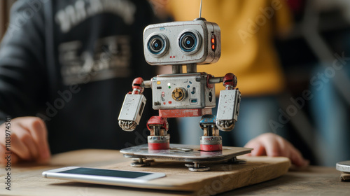 The watermark will not be included on Wall mural.: Diy balancing robot controlled from a phone - robotics for kids conceptual isometric banner - kids dev
