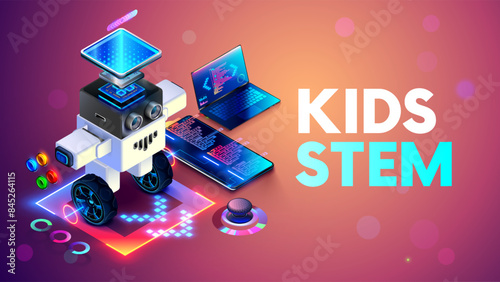 The watermark will not be included on Wall mural.: Diy balancing robot controlled from a phone - robotics for kids conceptual isometric banner - kids dev