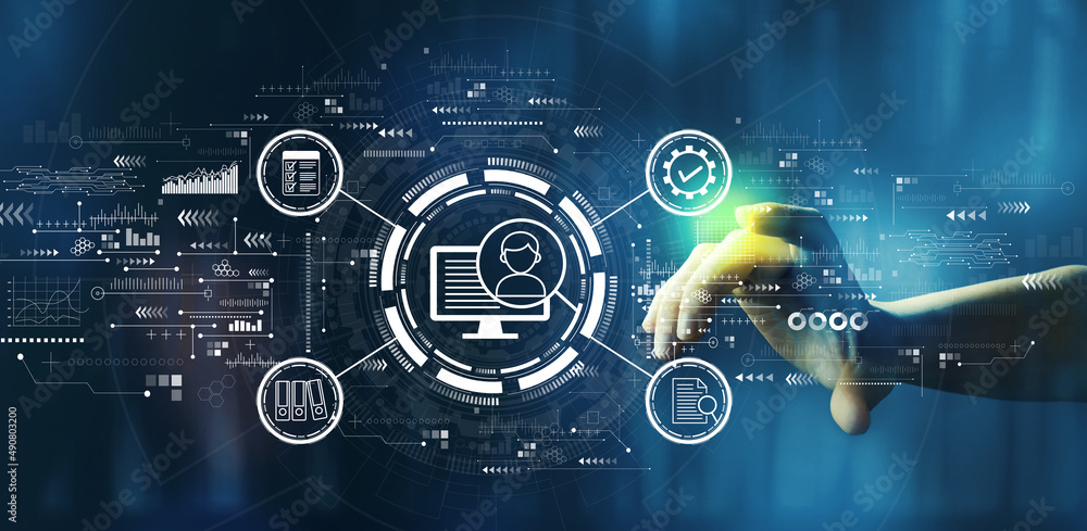 The watermark will not be included on Wall mural.: Document management system concept with hand pressing a button on a technology screen