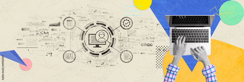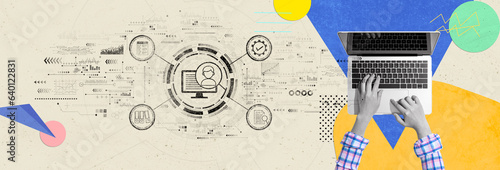 The watermark will not be included on Wall mural.: Document management system concept with person using a laptop computer - photo collage design