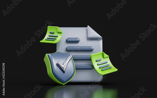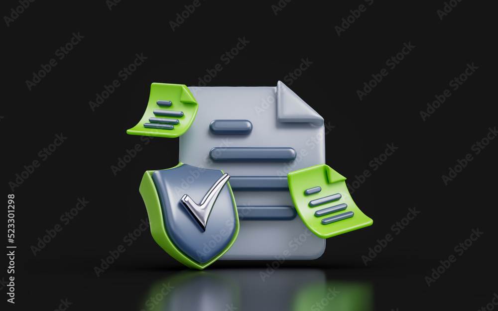 Wall mural document with security shield check mark sign on dark background 3d render concept for protection