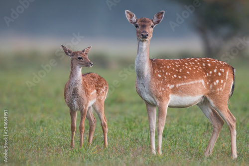 The watermark will not be included on Wall mural.: Doe and fawn fallow deer, dama dama, in autumn colors - detailed image of two wild animals with blurr