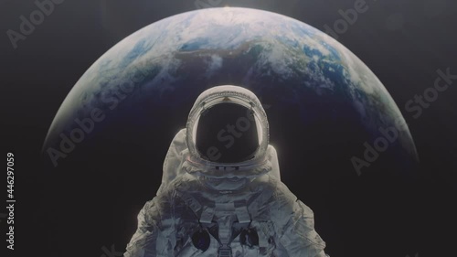 Wall mural dolly in shot of an astronaut with planet earth n the background.