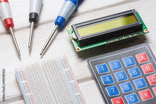 Wall mural : Door access control keypad, breadboard and display on the white background -
