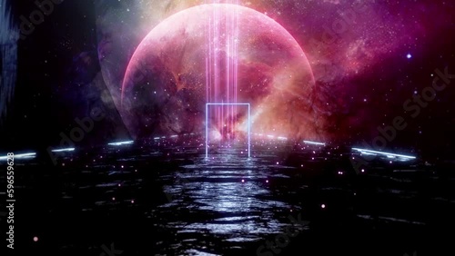 The watermark will not be included on Wall mural.: Door vj neon glow universal background loop - travel passing neon nebula on light bridge with star gl