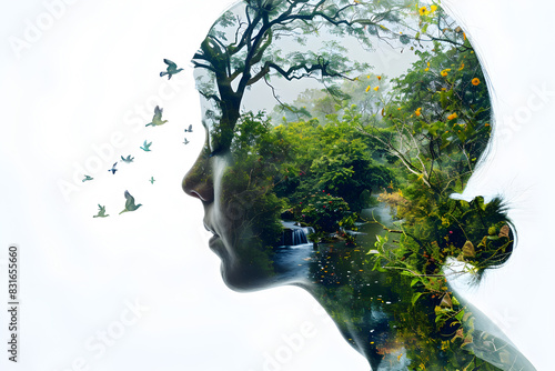The watermark will not be included on Wall mural.: Double exposure image of a human face merging with environment