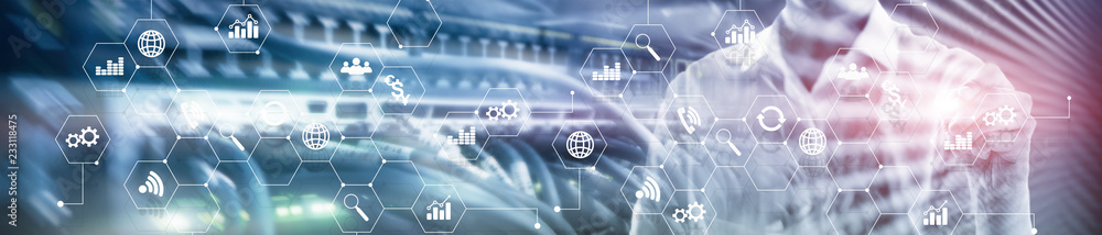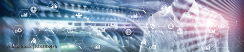 The watermark will not be included on Wall mural.: Double exposure mixed media - diagrams and icons on hologram screen - business people and modern city