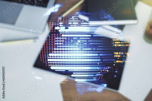 Wall mural : Double exposure of abstract creative programming illustration with world map and modern digital tabl