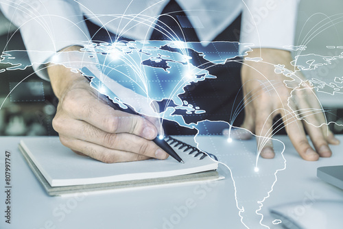 Wall mural : Double exposure of abstract digital world map with connections and hand writing in notepad on backgr