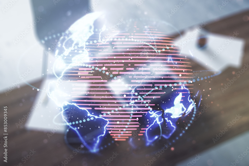 Wall mural double exposure of abstract digital world map with connections and modern desk with computer on back