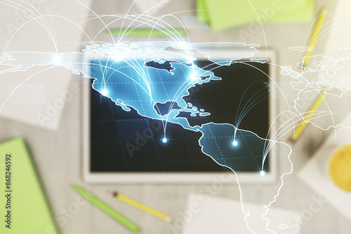 Wall mural double exposure of abstract digital world map with connections and modern digital tablet on backgrou