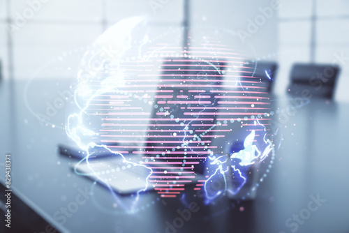 Wall mural double exposure of abstract digital world map with connections on computer background, big data and