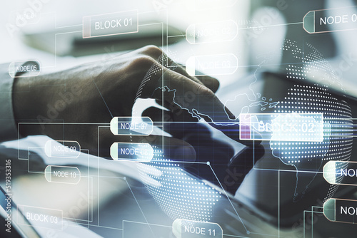 Double exposure of abstract programming language hologram with world map and finger clicks on a digiWall mural