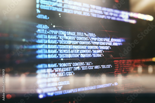 Wall mural : Double exposure of abstract programming language interface on modern business center exterior backgr