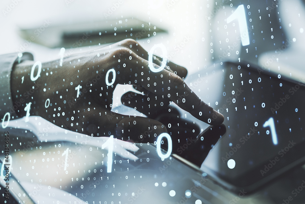 Wall mural double exposure of creative abstract binary code hologram and finger clicks on a digital tablet on b