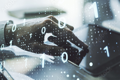 Wall mural double exposure of creative abstract binary code hologram and finger clicks on a digital tablet on b - Wall murals Wall mural double exposure of creative abstract binary code hologram and finger clicks on a digital tablet on b - Wall murals