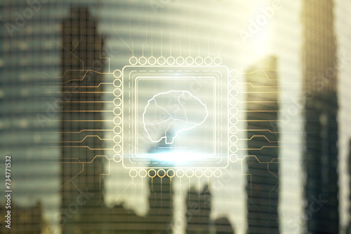 Wall mural double exposure of creative artificial intelligence interface on modern skyscrapers background. neur