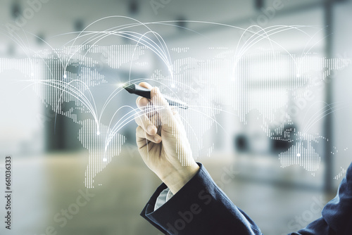 The watermark will not be included on Wall mural.: Double exposure of man hand with pen working with abstract digital world map hologram with connectio