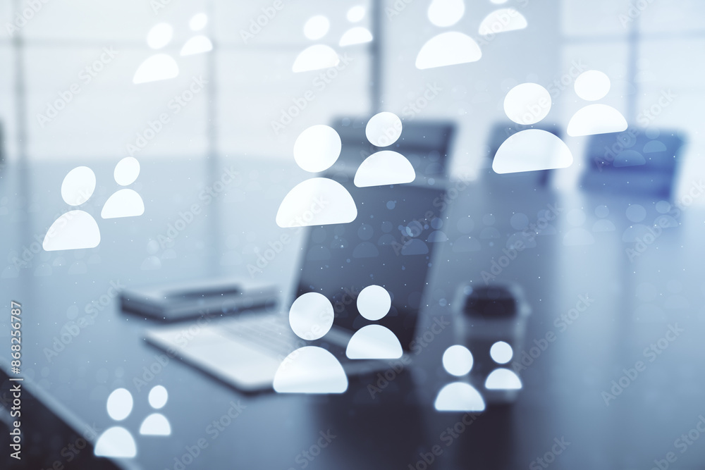 The watermark will not be included on Wall mural.: Double exposure of social network icons concept with computer on background - networking concept