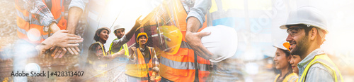 Wall mural double exposure of team railway engineer is on duty in work site with abstract bokeh backgrounds, us
