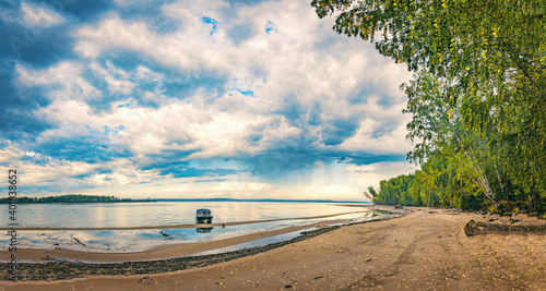 The watermark will not be included on Wall mural.: Dramatic autumn landscape with clouds, sandy river bank with fallen leaves - boat at the shore -