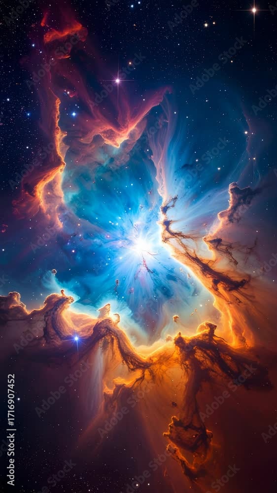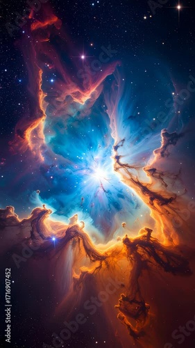 Dramatic nebula explosion in dark space, light rays shining through cosmic clouds and stardust, creaWall mural